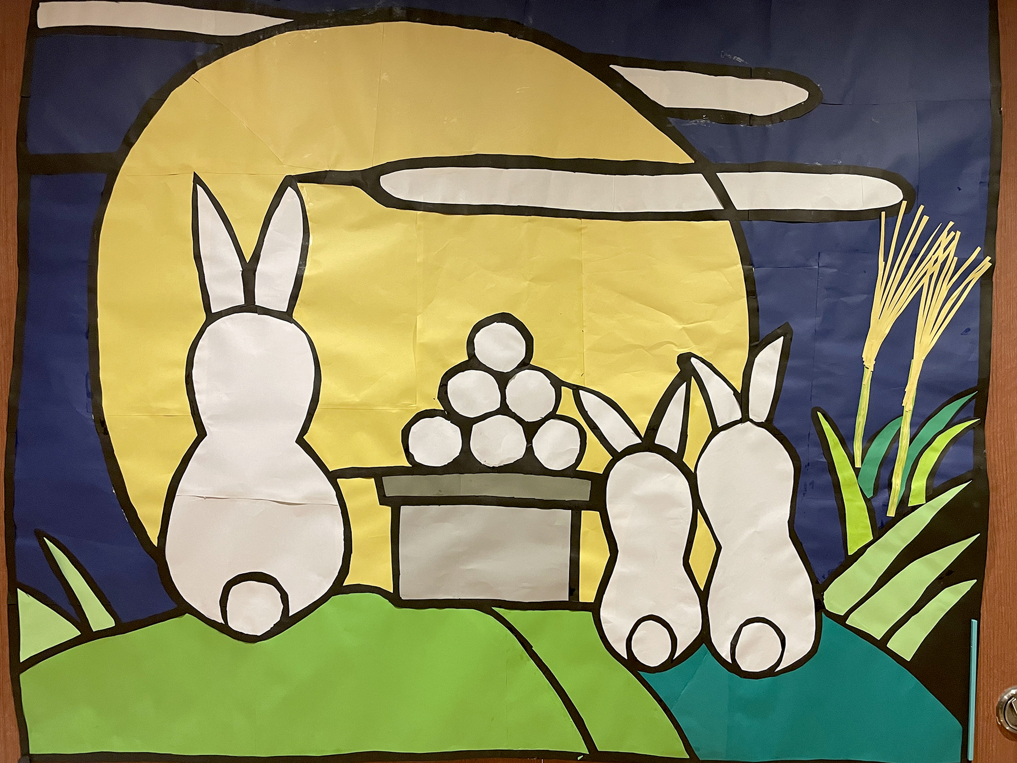 遠くから見ても良く映えるようにお月様を大きく作り、ウサギの親子を表現しました。