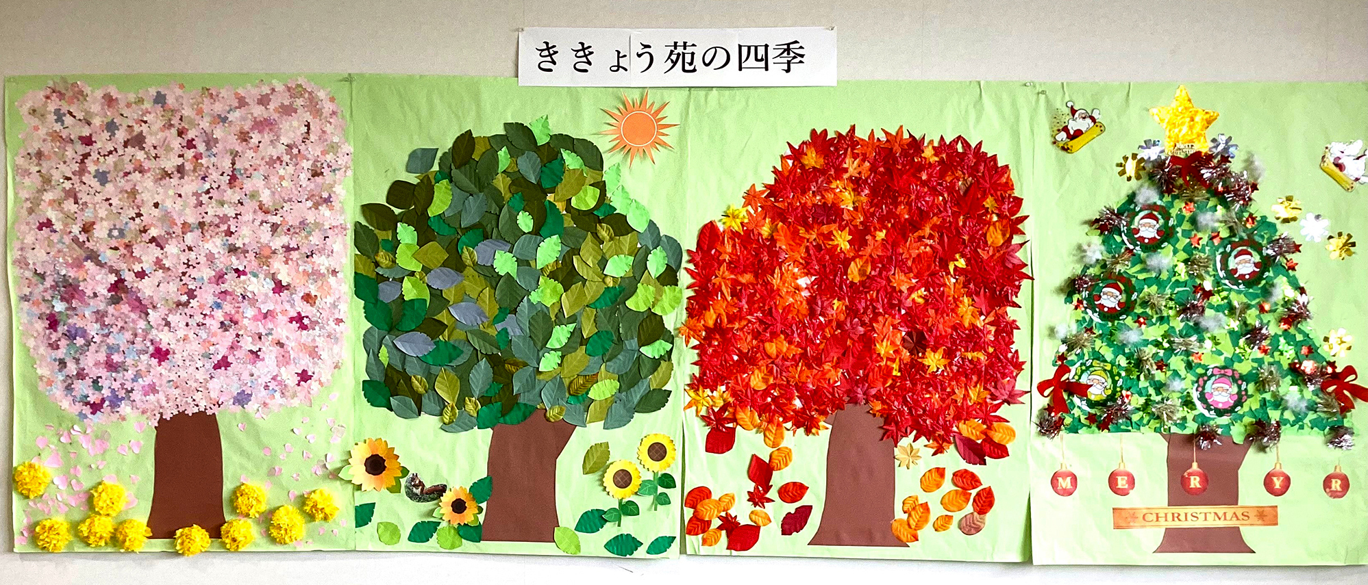 皆で協力し仕上げることができるように模造紙に大きく作成しました。自分の好みで好きな色の葉っぱや花びらを選んでもらい季節感がでるよう話し合いをしながら楽しく作成することができました。
