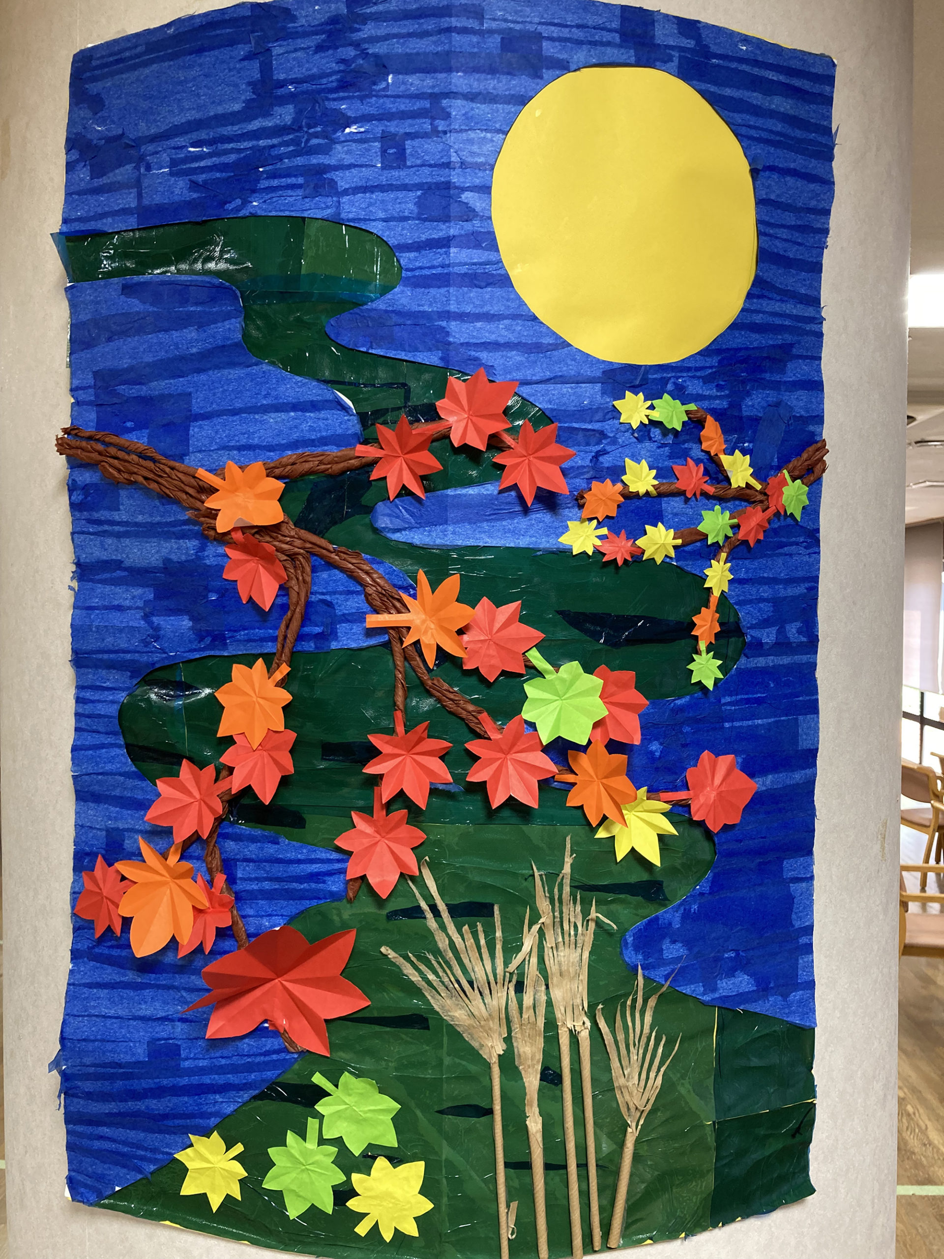 お月様と川を切り取ってセロハンで川の色を表現しました。紅葉は手作業で1枚1枚切りました。紅葉の配置は全てご利用者様同士で話し合いながら作成進めました。小さいながらもとても風情がある作品に仕上がりました。アピールポイントは、セロハンで川が流れている様子が上手に表現できている所です。