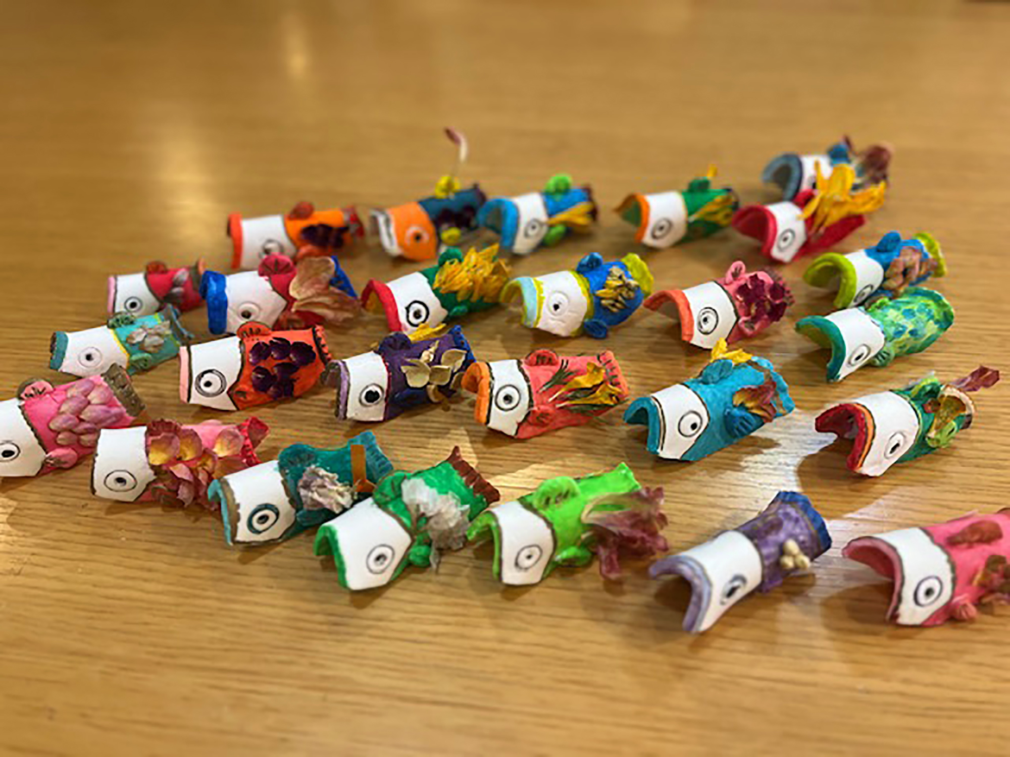 紙粘土でパーツを一つずつ付けて、うろこにドライフラワーを付けました。全部で25名が参加しました。