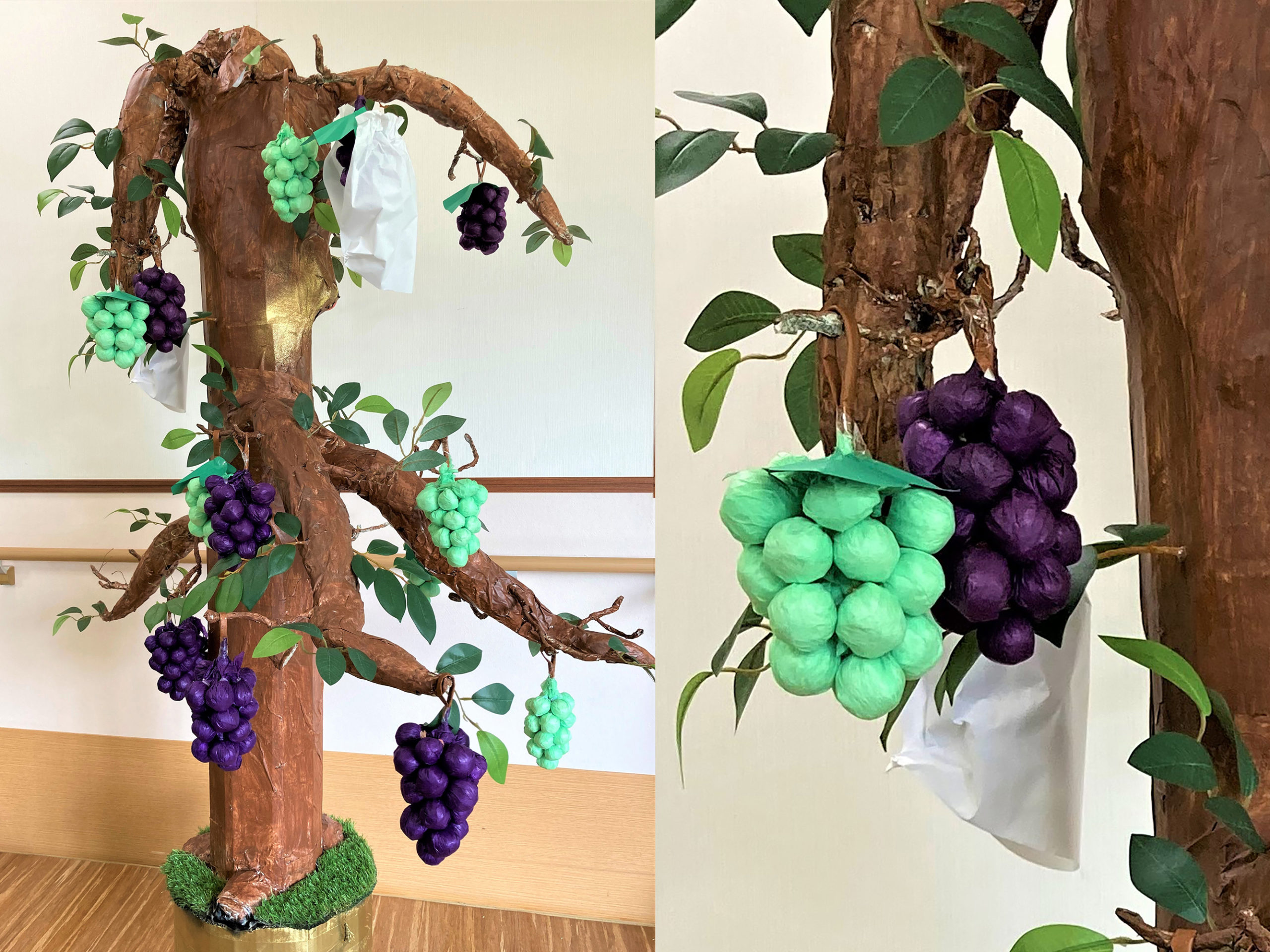 実のなる木は、年間を通して様々な実をつけます。季節ごとに旬の木の実や果物を作成し「実のなる木」として完成します。秋の旬ということで今回はぶどうの木となりました。ぶどうの実は一つ一つ紙を丸めてお花紙で包むことでぶどうの実となります。まん丸にするのが難しく粒が沢山必要となる為、作成に時間がかかりましたが利用者様が協力して取り組み完成となりました。