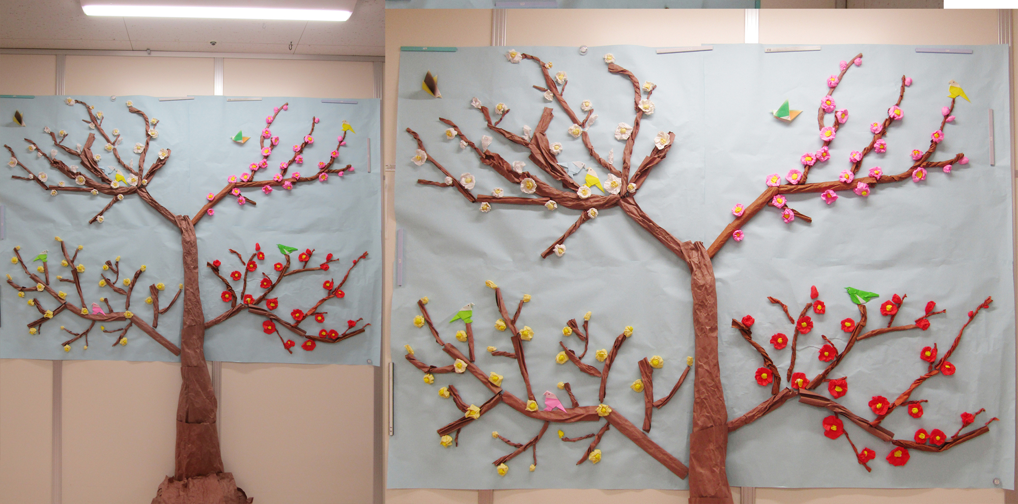 製作をする上で工夫したところは、誰にでも簡単に出来る方法です。作成時は、4つのグループに分かれて、折り紙をクシャクシャにして花の形を作り、幹や枝は画用紙をクシャクシャにしたり、ちぎったりして質感を出しました。出来上がるとそれぞれ見事な花が咲き立派な個性ある枝ぶりとなりました。職員も鶯を折りにぎやかな梅の木が出来上がりました。