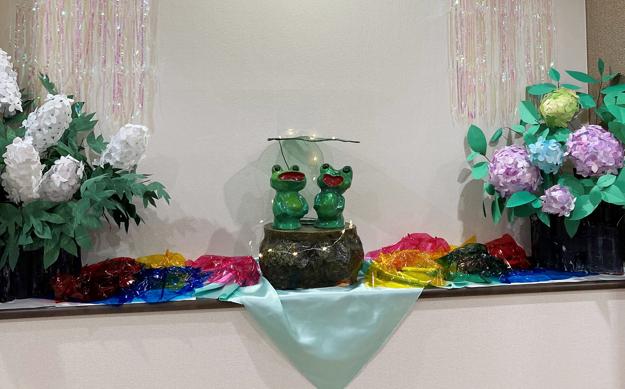 アジサイはコピー用紙を染めて花の色を作り一つ一つ立体的になるように作成しました。カエルの表情が一番難しかったのですが、ご利用者様と相談しながら歌っているような表情を実現しました。カエルの表情に注目してみて頂けると嬉しいです。