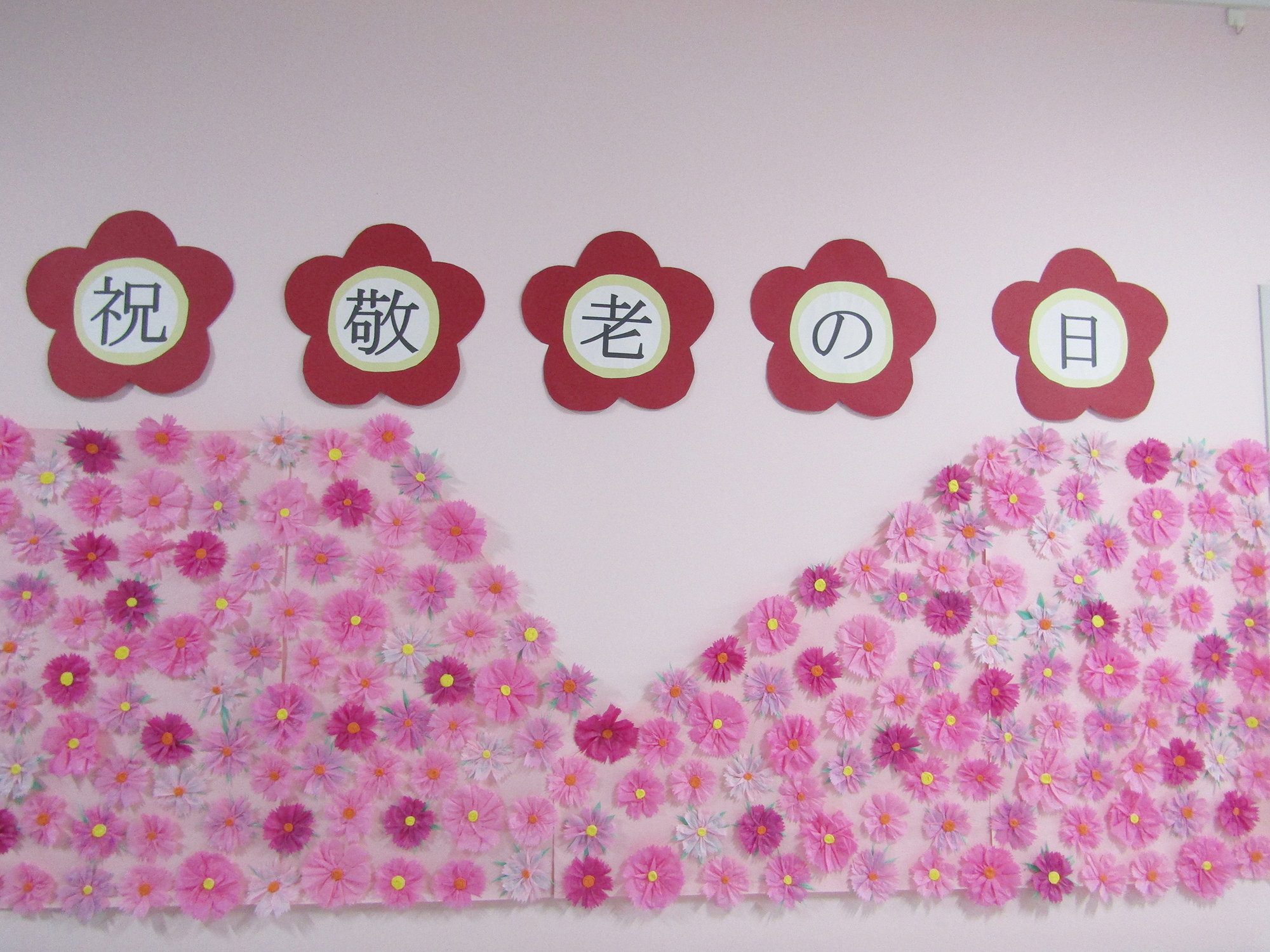 「秋桜は咲いているのかい」とテレビを観ながら入居者様が会話しているのを聞いてフロアに秋桜を咲かせようと思い、入居者様と一緒にたくさんの秋桜を咲かせることができました。入居者様は、壁一面のきれいな秋桜を見ながら笑顔があふれていました。