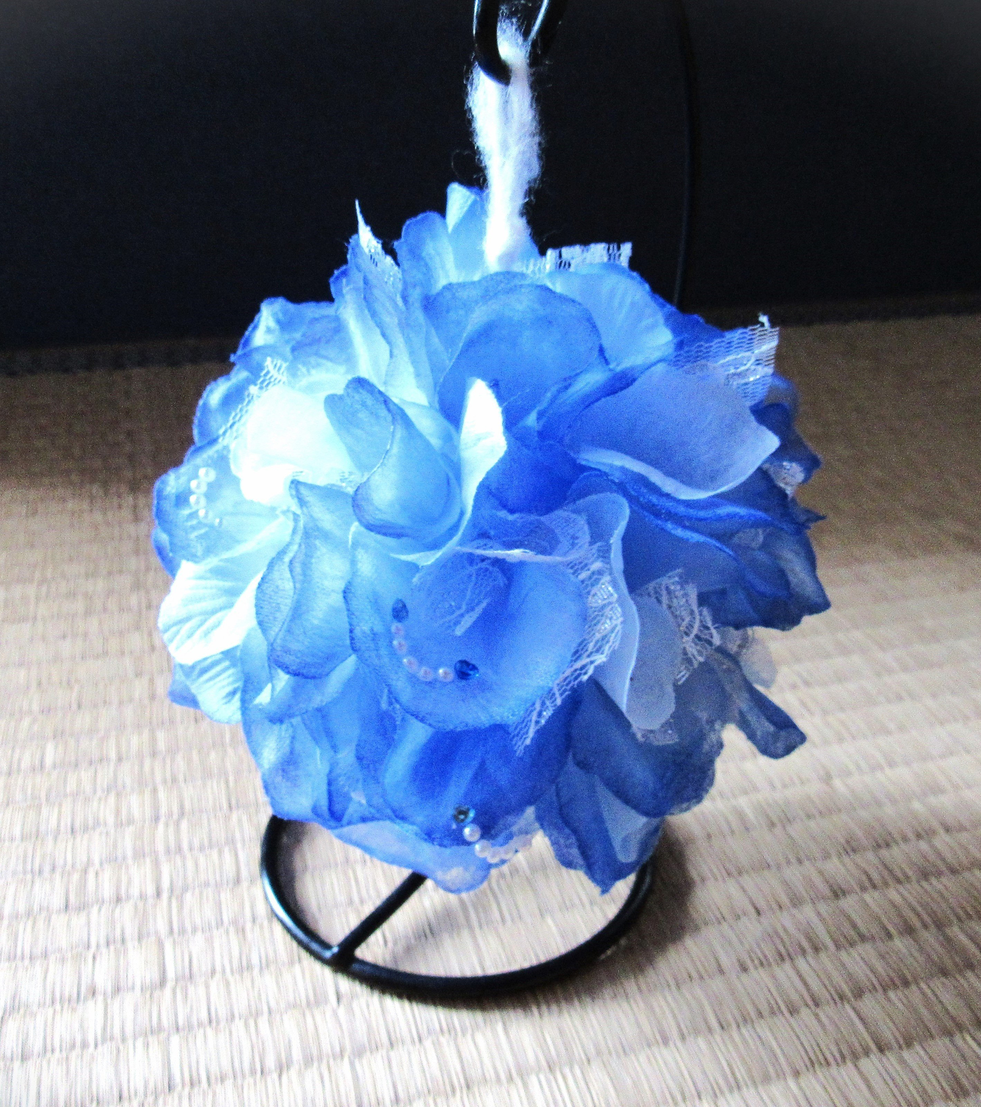 ブルーのあじさいが雨のしずくで光っています。やきとりの串を使って、布を発泡スチロールに差し込んでいきました。